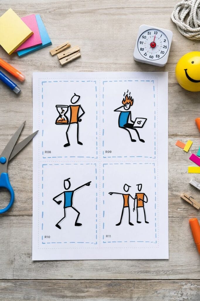 7 kart do druku (po 4 postacie na stronie) – idealne na warsztaty, do pracy z metaforą, na rundy wprowadzające lub podsumowania.
